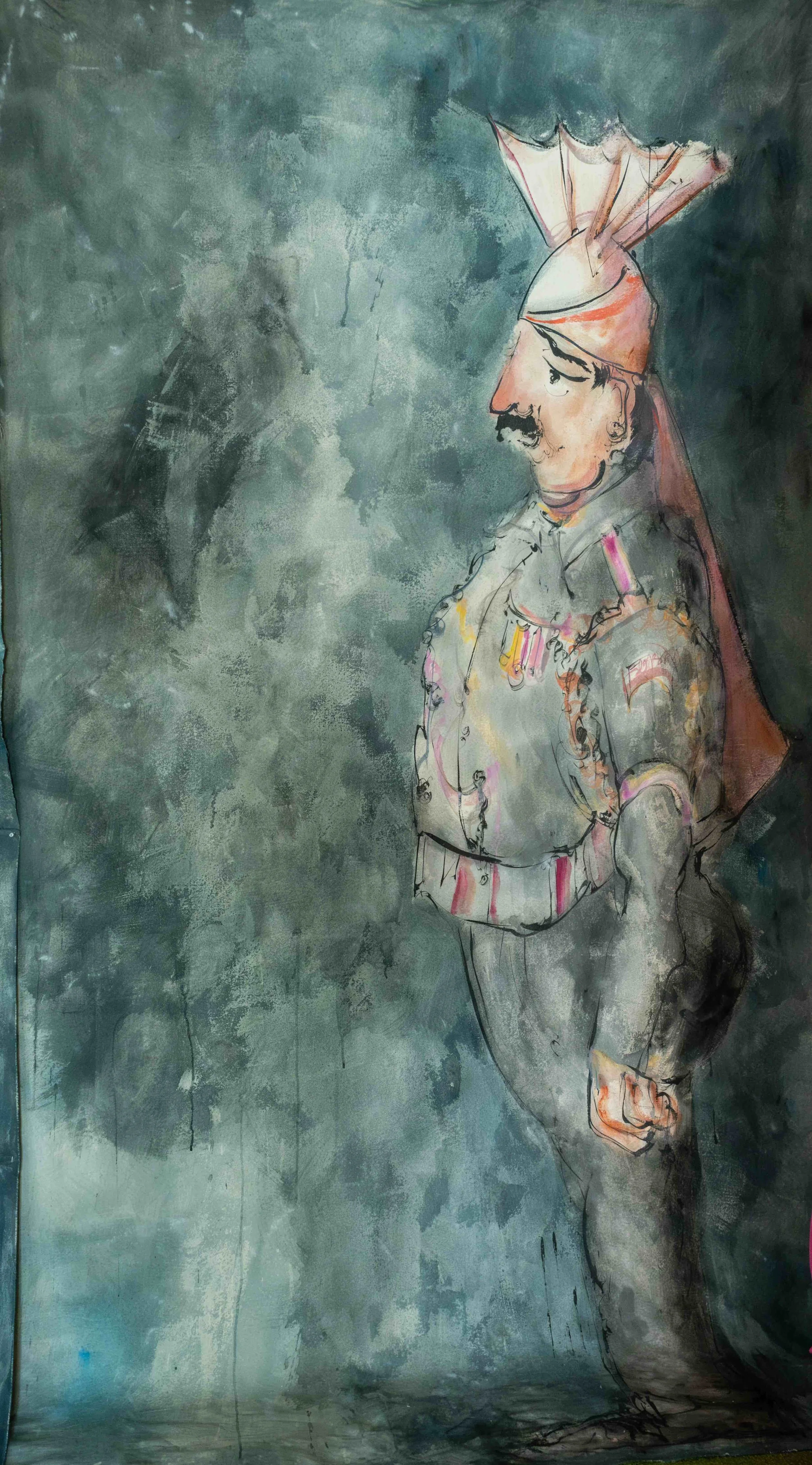 Under the same blue sky (part 1), ink, acrylic, and oil on canvas, 2025, 116 x 60 in