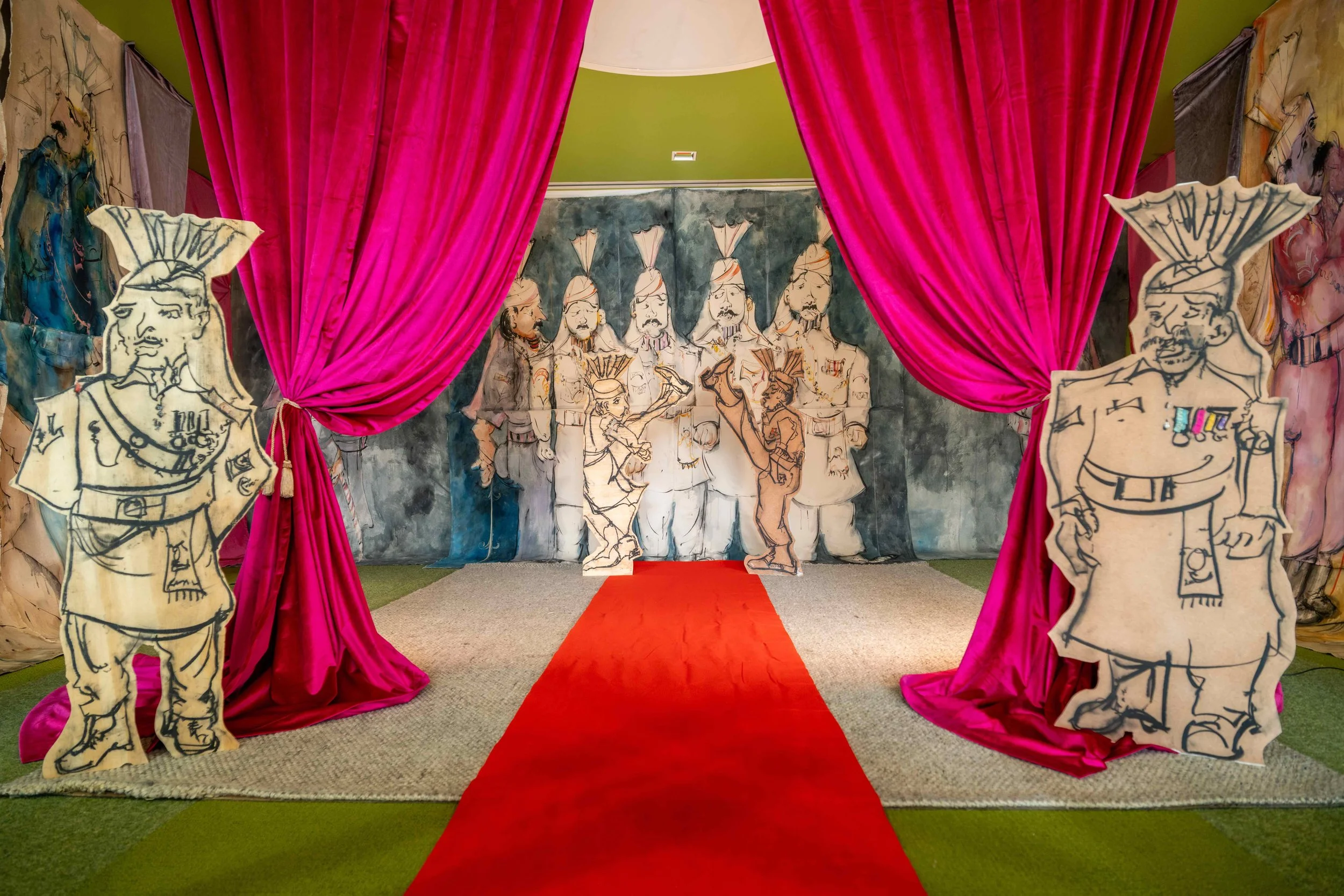 Border Play exaggerates the ceremony’s spectacle so as to reveal its inherent theatricality. Heard before it is seen, bugle calls and actor/singer Kishore Kumar’s bright vocals summon viewers to walk a red carpet through loosely draped hot pink curtains flanked by wooden soldiers. Within, somewhere between back- and center stage, are animated, painted, and sculpted soldiers who inhabit an imagined ceremony that welcomes the question of not just which side of the border you have found, but also whether a border occupies this space at all.
