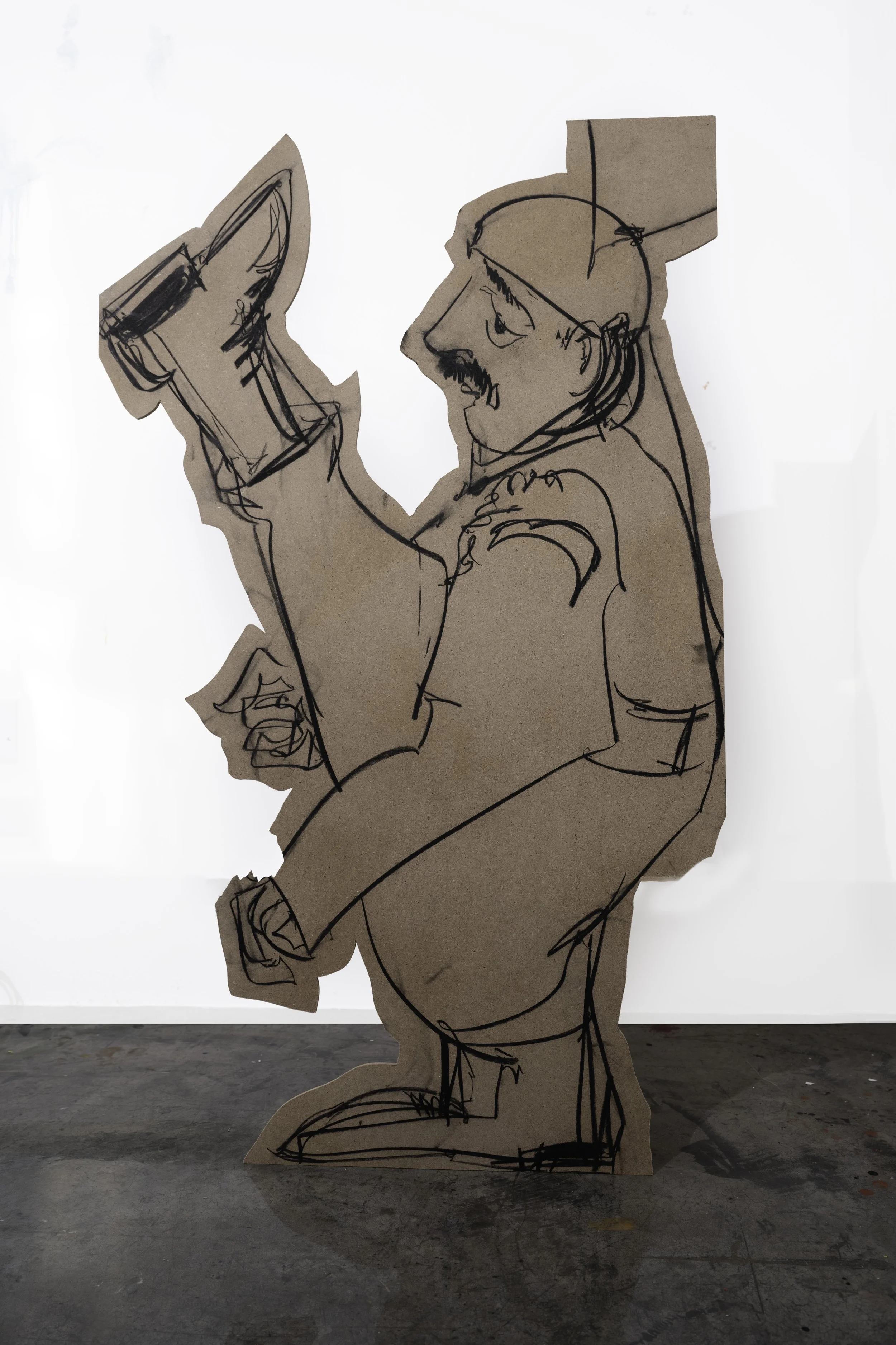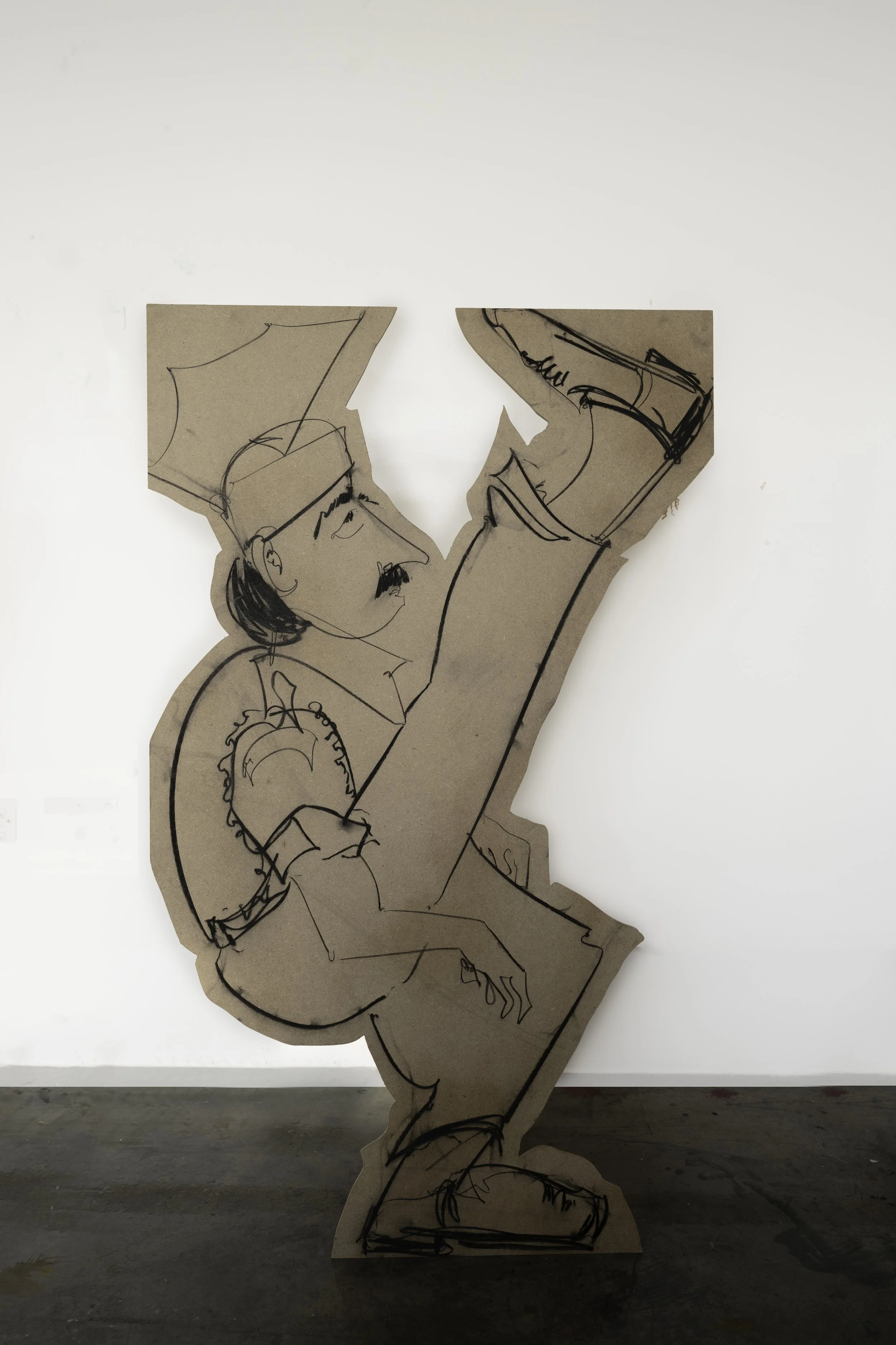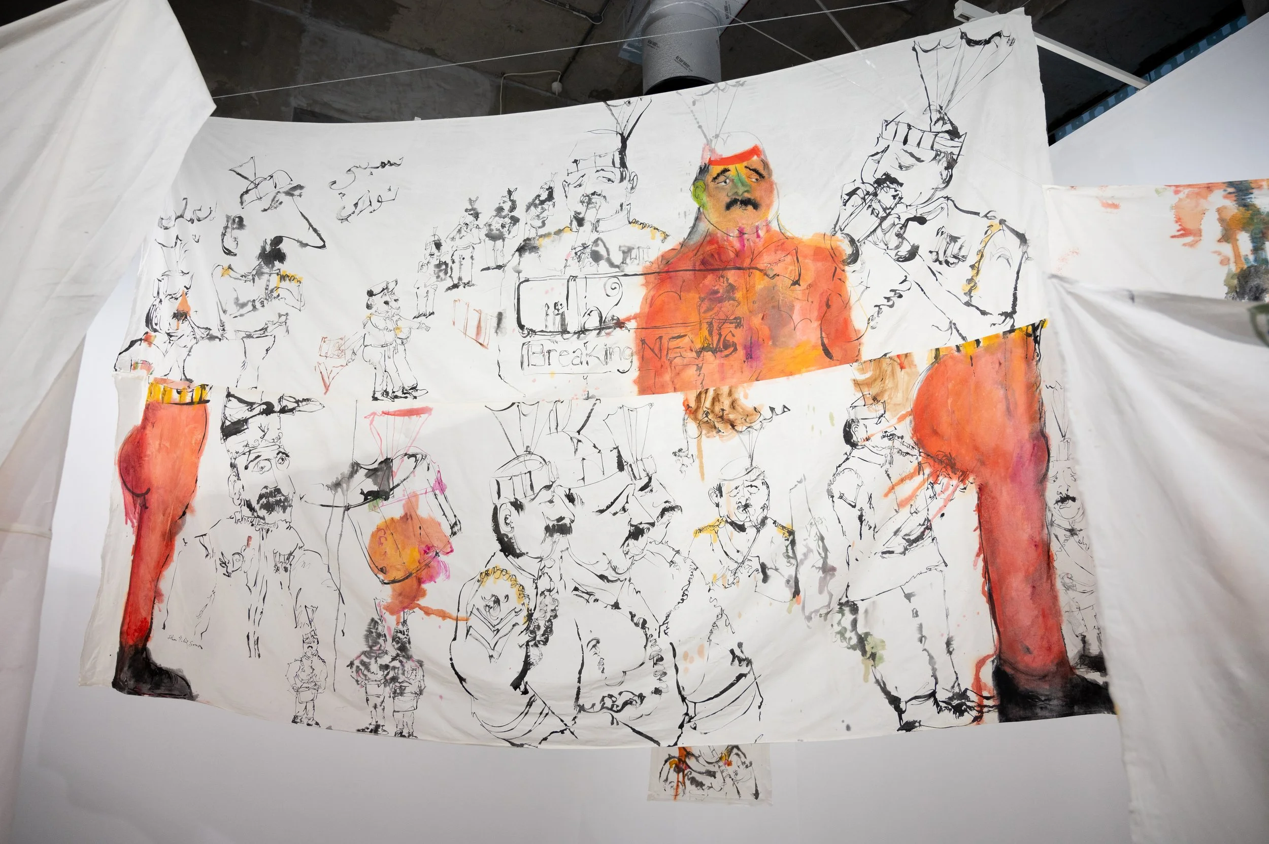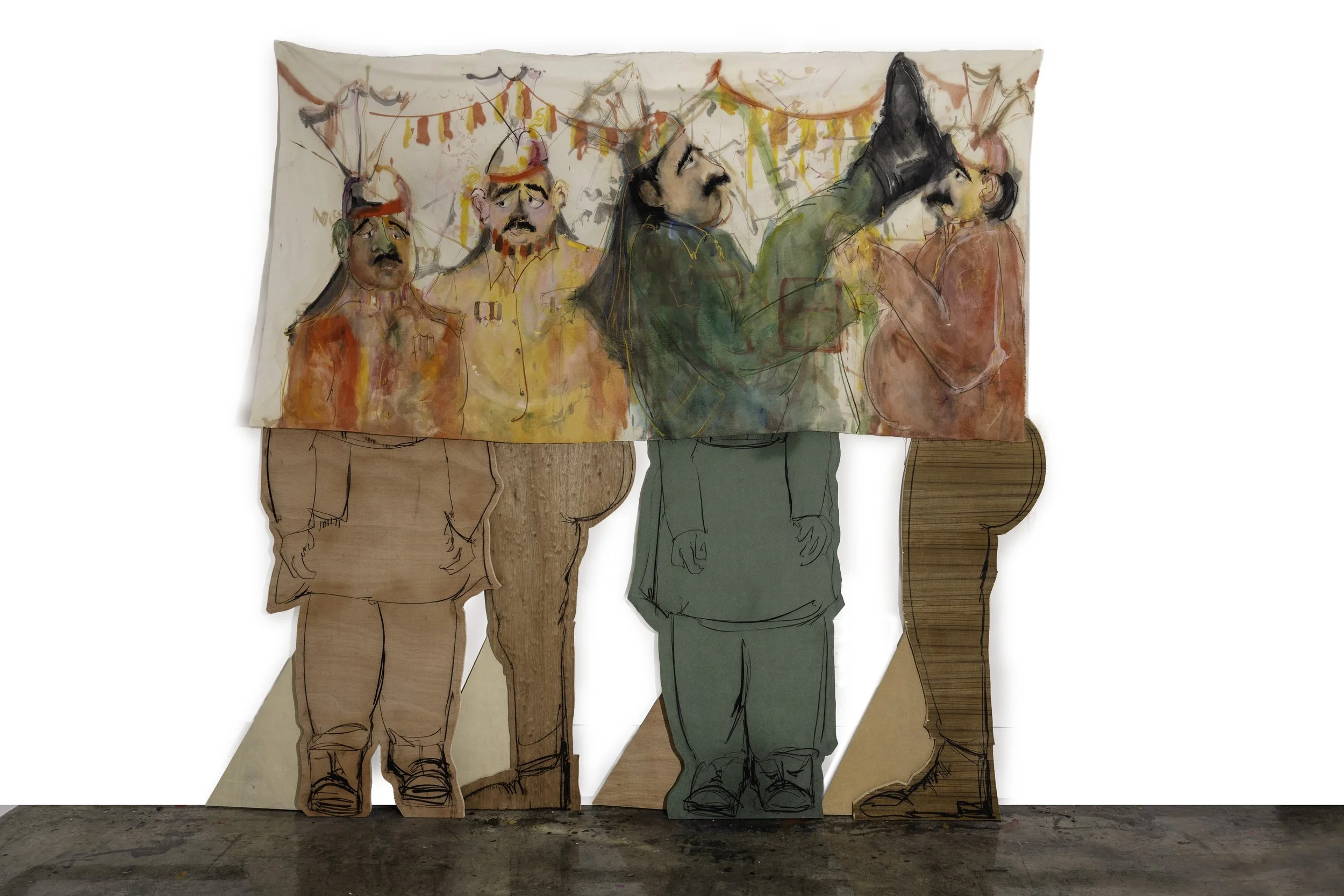 Footnotes coalesces Ahmed’s multidisciplinary practices of painting, drawing, and sculpture. The heart of the work is a layered series of suspended paintings on muslin, hung at eye level, inviting viewers to walk around and between them, to see both sides, and experience the act of “crossing” without restriction. This is in dialogue with plywood cut-out figures marked with gestural charcoal drawings, their solid bodies echoing and extending the figures on the muslin. Across these varied media, Ahmed’s playful linework captures the musicians in their elaborate uniforms and heightens their gestures. Through absurdity and individuality, she creates a counternarrative to the grand pronouncements of the border ceremony.