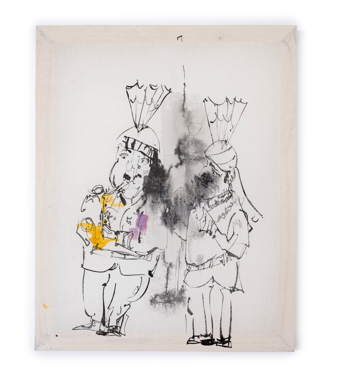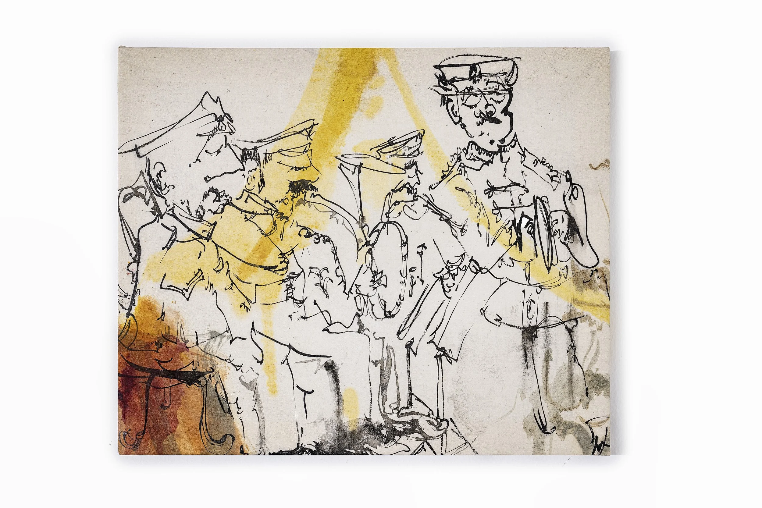 Band practice, 2026, oil and ink on muslin, 12 × 14.5 in.