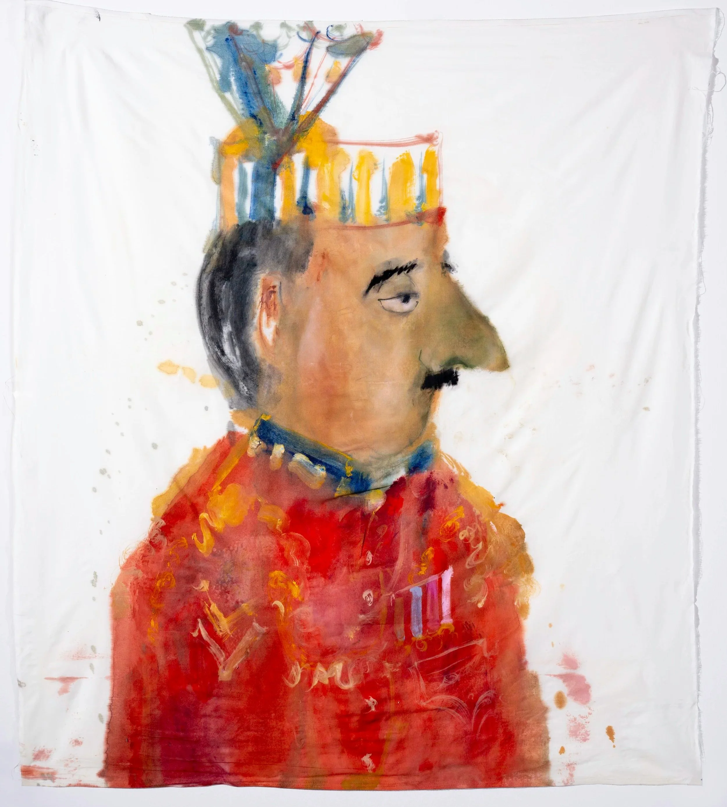 “Rare performance!”, 2026, oil and ink on muslin, 18 × 13 in.